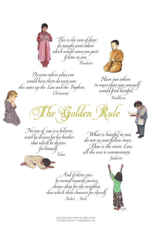 Welcome to Golden Rule Art, the online home of Jeff Streiff's illustration of "The Golden Rule". The Golden Rule is a moral law that is expressed with remarkably similar language in all the world's great religions. This print was designed to remind of us that despite humankind's diverse customs, cultures and religions, our spiritual roots are the same.